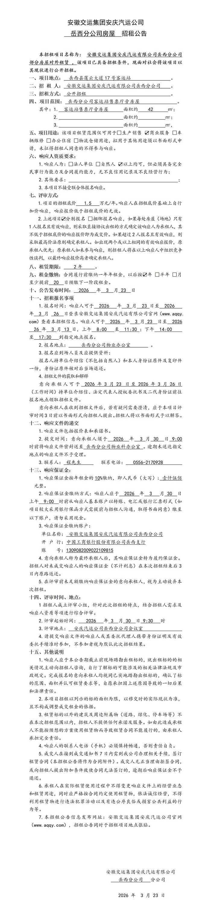 岳西分公司房屋招租公告
