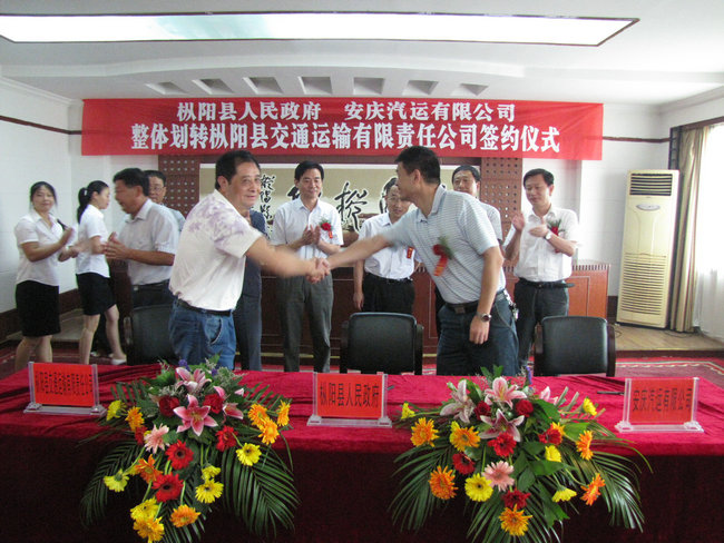 2011年9月1日,樅陽(yáng)縣人民政府、安徽省交通集團(tuán)安慶汽運(yùn)有限公司整體劃轉(zhuǎn)樅陽(yáng)縣交通運(yùn)輸有限責(zé)任公司簽約儀式在樅陽(yáng)迎賓館會(huì)議大廳內(nèi)隆重舉行。樅陽(yáng)縣縣長(zhǎng)何謙、副縣長(zhǎng)胡海峰,省交通集團(tuán)汽車運(yùn)輸有限公司副總經(jīng)理方詩(shī)喬,安慶汽運(yùn)有限公司董事長(zhǎng)張進(jìn)、黨委書(shū)記徐軍、副總經(jīng)理王中明、彭宏、紀(jì)委書(shū)記郭峰,樅陽(yáng)縣交通運(yùn)輸有限責(zé)任公司經(jīng)理童子健出席了簽約儀式。
