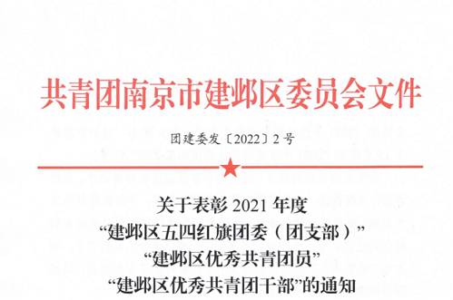 為表彰先進(jìn),樹(shù)立典型,在建團(tuán)百年之際,共青團(tuán)南京市建鄴區(qū)委員會(huì)下發(fā)了2021年度“兩紅兩優(yōu)”的表彰通知,其中公司團(tuán)委第一團(tuán)支部被授予“建鄴區(qū)五四紅旗團(tuán)(總)支部...